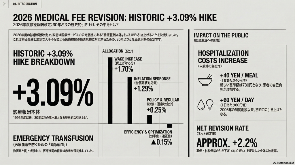 総じて、2026年度改定では人的資本への投資(賃上げ)と技術革新への投資(DX)という両面から、持続可能な医療提供体制への転換が図られることになります。