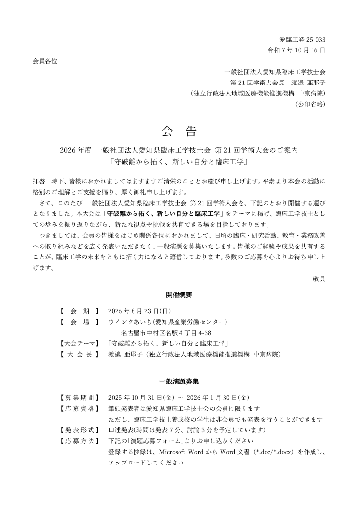 2026年度 一般社団法人愛知県臨床工学技士会 第21回学術大会のご案内